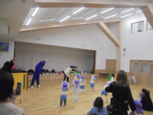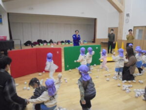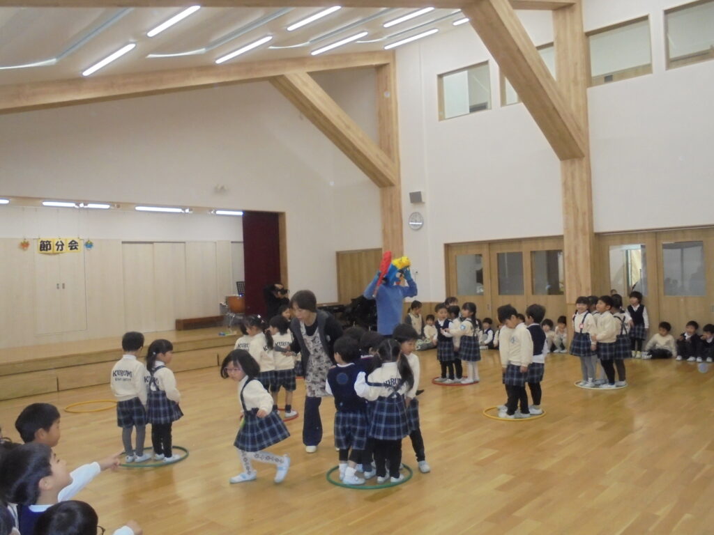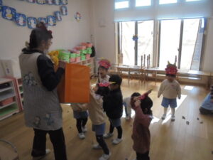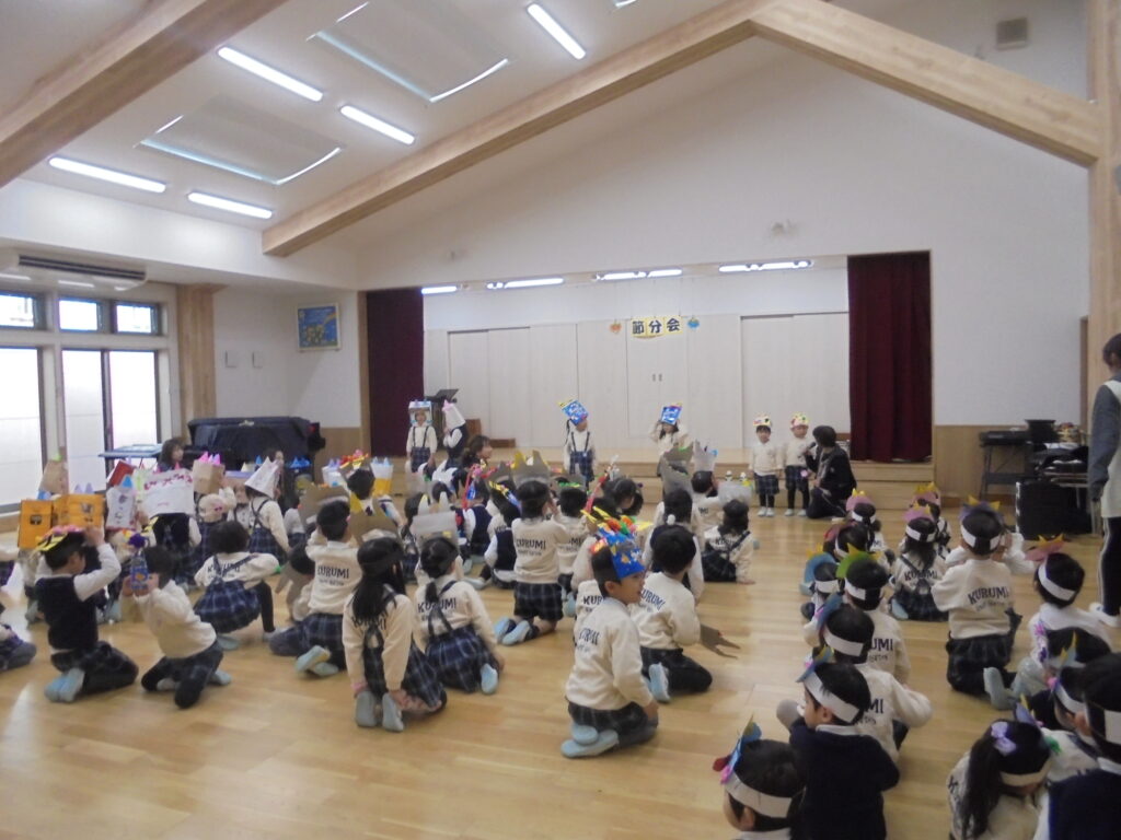 節分会 今日は節分会を行いました。節分についてのお話を聞いて鬼のお面の見せ合いっこをしました。また、 「鬼さんが転んだ」ゲームをしてみんな大はしゃぎで楽しんでいました。どんぐり・菫組のお友だちはお部屋で豆まき遊びをしました。(^▽^)/