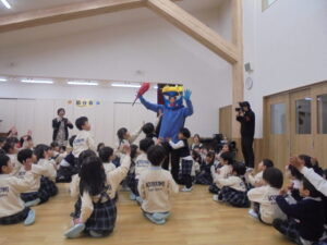 新年のお祝い会 1月8日(木)から3学期がはじまりました。みんな元気に来てくれましたね。今年もよろしくお願いします。9日(金)には、「新年のお祝い会」を行い、干支についてお話をしたりお正月の製作を見せ合いました。そしてお楽しみとして「マジックショー」をみんなで見て楽しみました。(^▽^)/