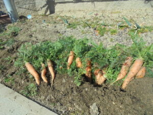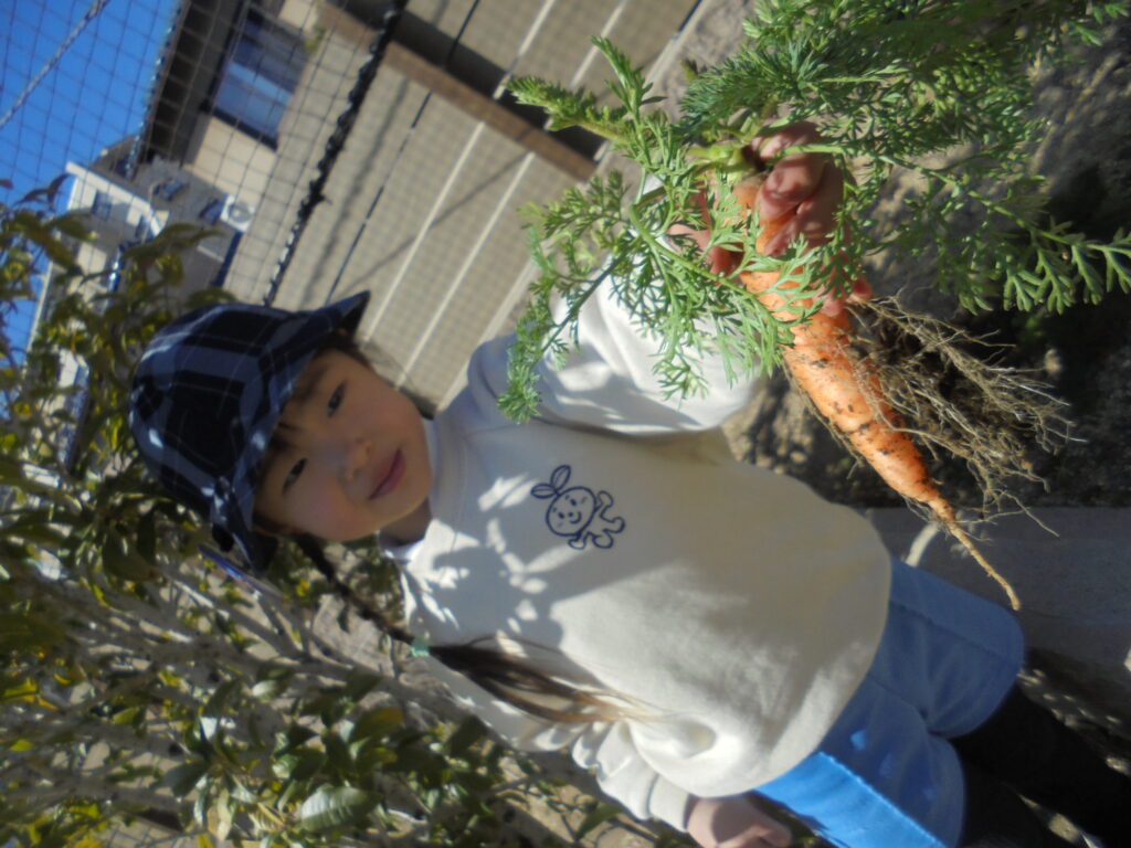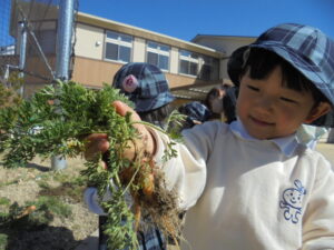 人参の収穫 年少組が秋に人参の種まきをして、今日、みんなで収穫をしました。毎日楽しみに花壇を見ていた子どもたち。まっすぐ上に抜こうと苦戦しながらも大きな人参が出てきて大喜びでした。みんな給食に入れてもらって食べるのが楽しみです。