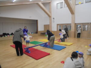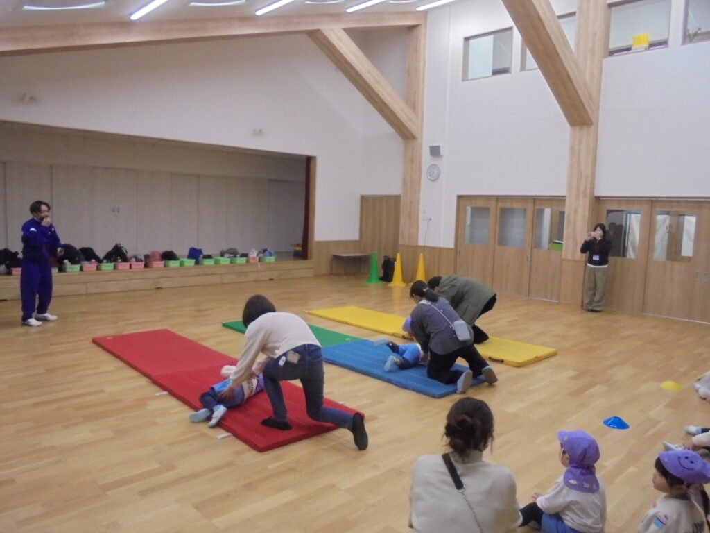 ふれあい参観日 今日は、どんぐり・菫組のお友だちの「ふれあい参観日」でした。お父さん、お母さんと一緒に、マットの上をお芋になってコロコロ転がったり、平均台からジャンプ、ボールをマットに当てて倒したりと楽しく運動遊びをしました。また、絵本の読み聞かせや手遊びをして、子どもたちの成長を感じていただきました。(^▽^)/