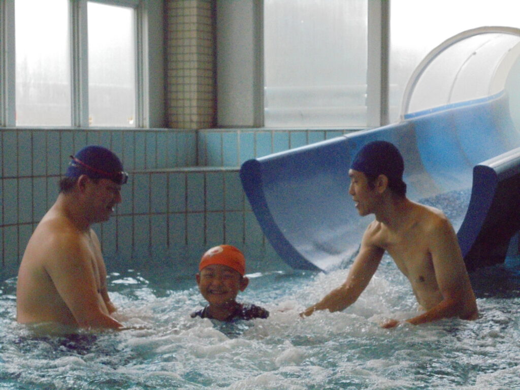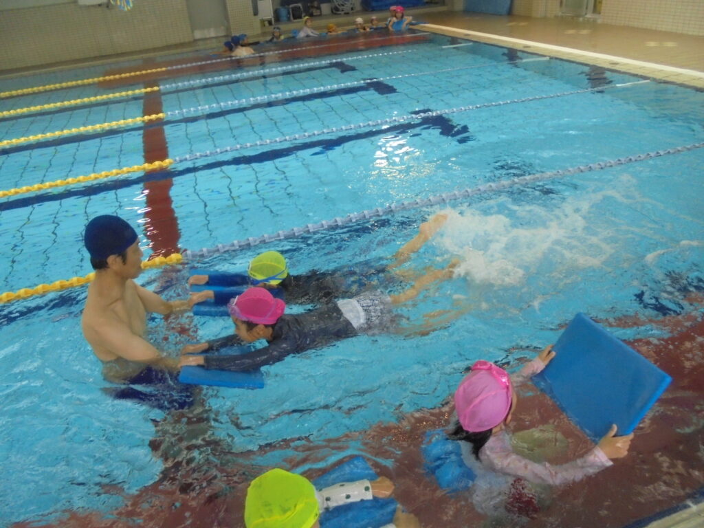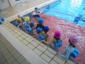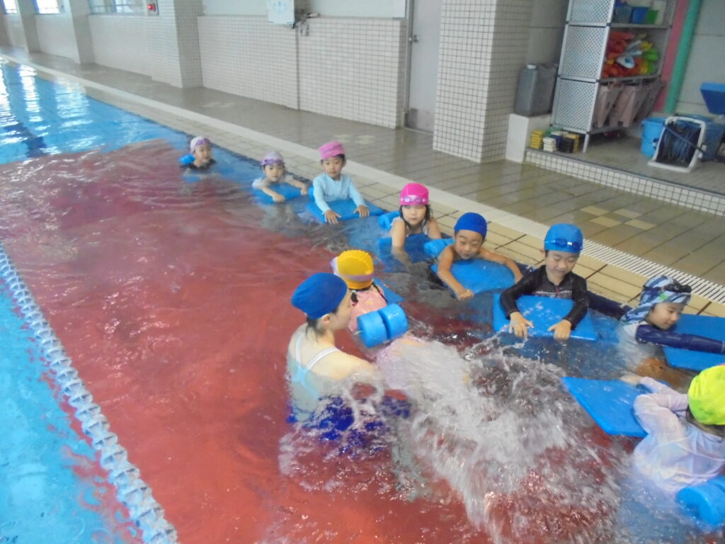 水泳教室 年中組・年長組は今年度最後の水泳教室(エース)がありました。グループに分かれて水に慣れる、バタ足で泳ぐ等、楽しく水に親しんていました。最後には、スライダーを自信をもって滑べることができました。