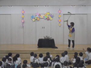 敬老の集い 敬老の日の前に、幼稚園では「敬老の集い」を行いました。3人のお祖母ちゃんをお迎えして、自己紹介やゲームを一緒にしてもらいました。玉入れゲームでは、みんな真剣にボールを投げて大はしゃぎでした。最後に「いつまでもお元気でいてくださいね。」と伝えお守りのプレゼントを渡しました。 幼稚園の廊下では、夏休みの思い出カレンダーを貼っています。みんなの楽しかった思い出がいっぱいあり、素敵な夏休みを過ごしましたね。(^▽^)/