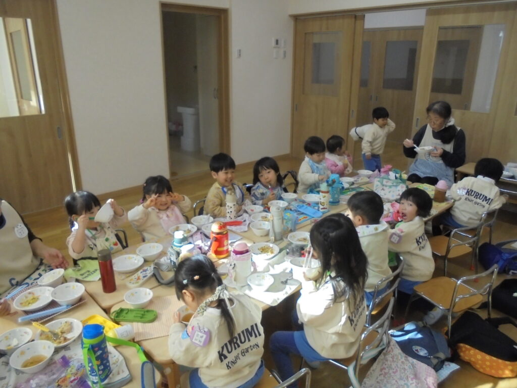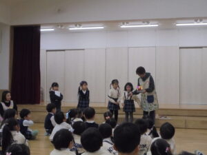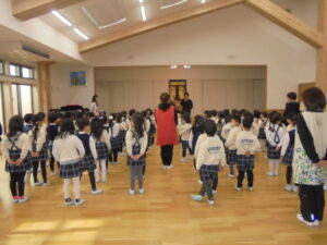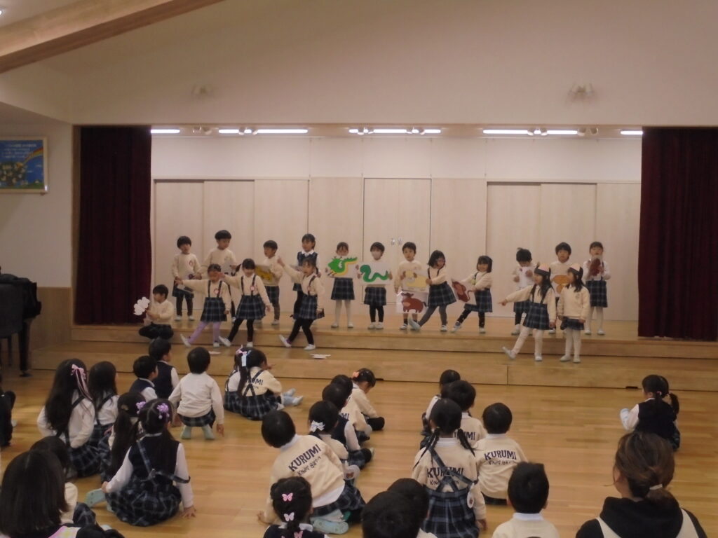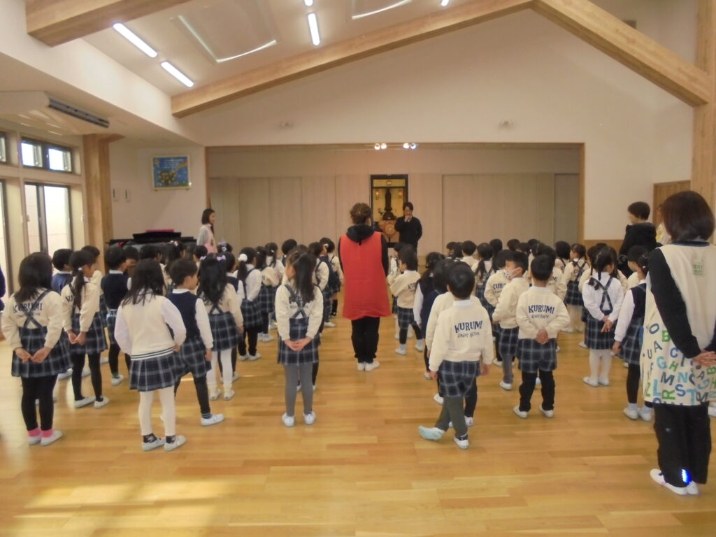 終園式 今日で2学期が終わります。終園式を行い2学期にはたくさんの行事があり楽しかったことを振り返りました。そして各クラスではワークをしたり、漢字の絵本を読んだりしました。午後からはお部屋の掃除やゲームなどをして過ごしました。明日から冬休みです。元気に過ごしてくださいね。