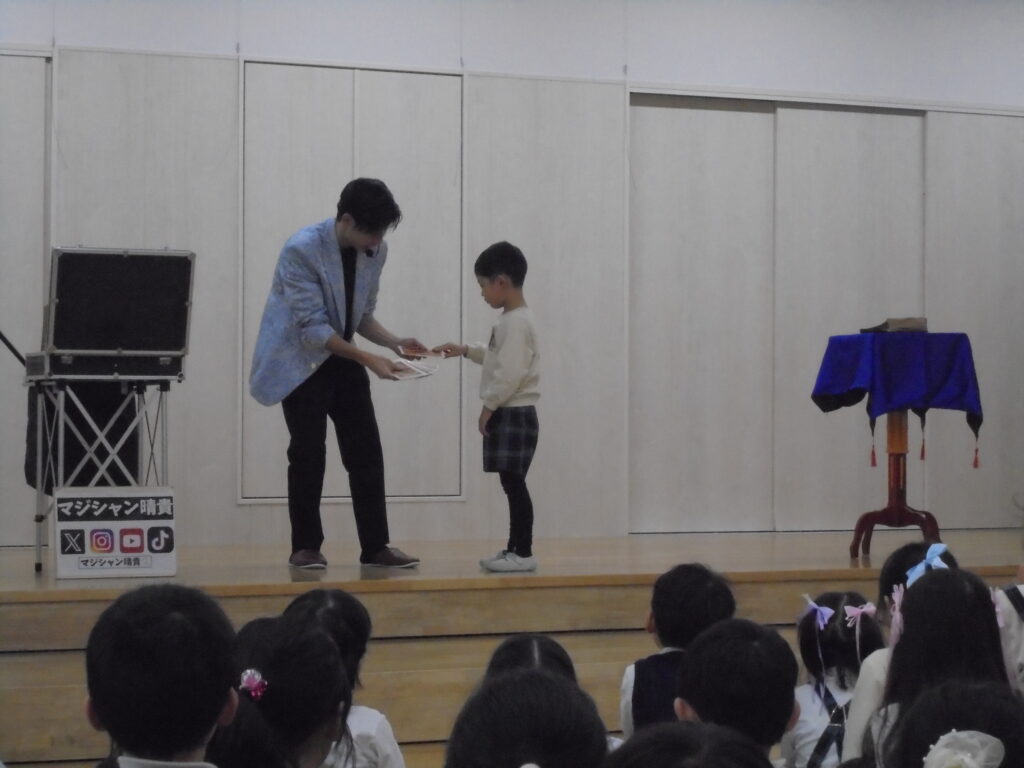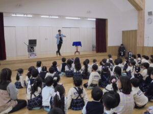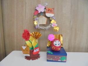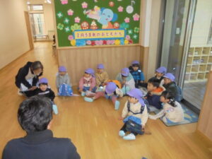 新年のお祝い会 1月8日(木)から3学期がはじまりました。みんな元気に来てくれましたね。今年もよろしくお願いします。9日(金)には、「新年のお祝い会」を行い、干支についてお話をしたりお正月の製作を見せ合いました。そしてお楽しみとして「マジックショー」をみんなで見て楽しみました。(^▽^)/
