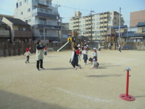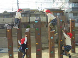 青空の下 今日は年中組と年長組が近くの公園へ遊びに行きました。お天気も良く、いっぱい走って鬼ごっこをしたり、ジャングルジムやすべり台で遊んだりしました。色とりどりの落ち葉を拾ったりもしました。にこにこ笑顔で帰ってきました。