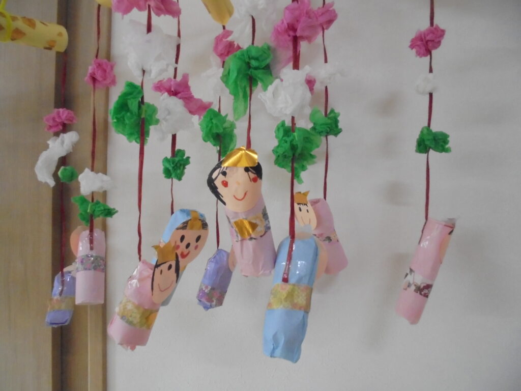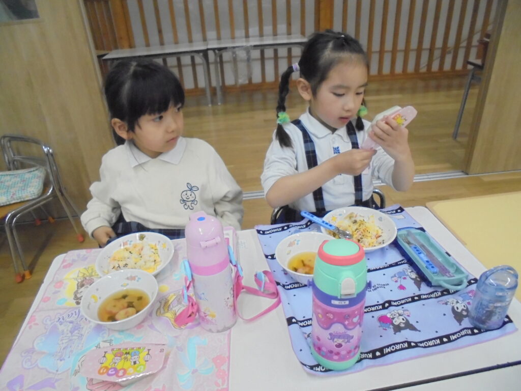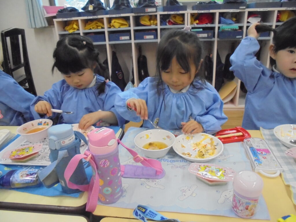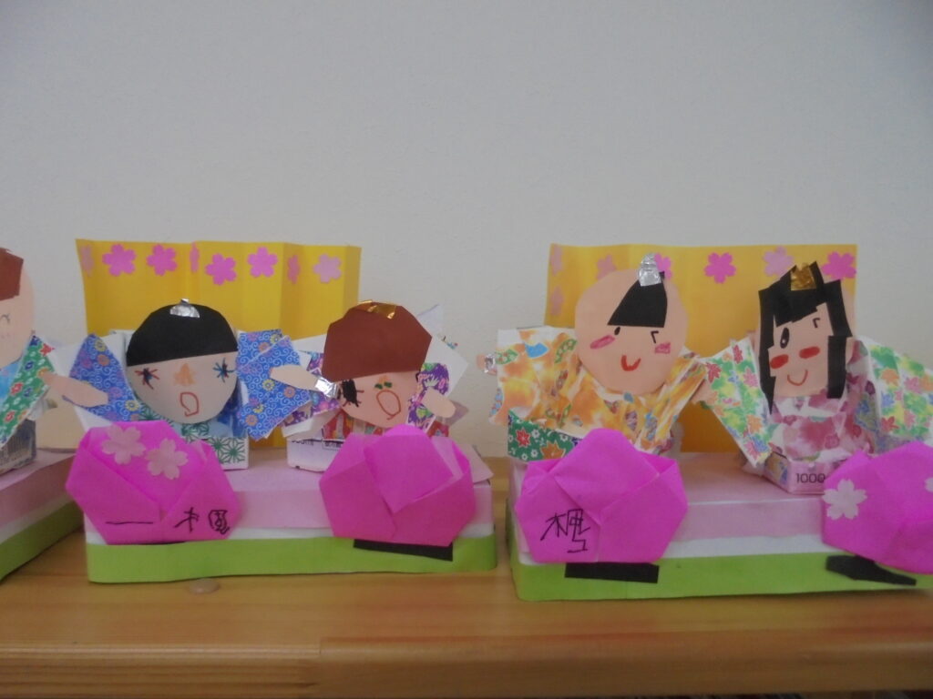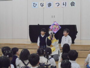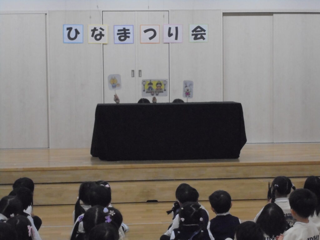 ひなまつり会 今日は、3月3日。「ひなまつり」ペープサートを見てお歌を歌ったり、学年ごとに作ったお雛さまを見せ合いっこして楽しい「ひなまつり会」を行いました。給食もちらし寿司、すまし汁、三色ゼリーでみんな美味しく食べていました。素敵なひなまつりになりました。(^▽^)/